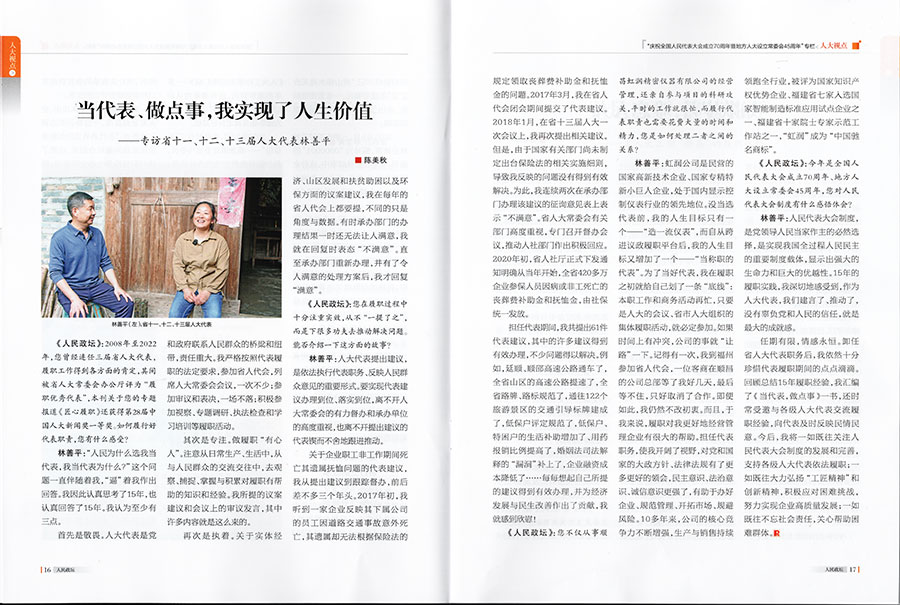 林善平:虹潤公司是民營的國家高新技術企業(yè)、國家專精特新小巨人企業(yè),處于國內(nèi)顯示控制儀表行業(yè)的領先地位。沒當選代表前,我的人生目標只有一個——“造一流儀表”,而自從跨進議政履職平臺后,我的人生目標又增加了一個——“當稱職的代表”。為了當好代表,我在履職之初就給自己劃了一條“底線”:本職工作和商務活動再忙,只要是人大的會議、省市人大組織的集體履職活動,就必定參加。如果時間上有沖突,公司的事就“讓路”一下。記得有一次,我到福州參加省人代會,一位客商在順昌的公司總部等了我好幾天,最后等不住,只好取消了合作。即便如此,我仍然不改初衷。而且,于我來說,履職對我更好地經(jīng)營管理企業(yè)有很大的幫助。擔任代表職務,使我開闊了視野,對黨和國家的大政方針政策、法律法規(guī)有了更多更好的領會,民主意識、法治意識、誠信意識更強了,有助于辦好企業(yè)、規(guī)范管理、開拓市場、規(guī)避風險。10多年來,公司的核心競爭力不斷增強,生產(chǎn)與銷售持續(xù)領跑全行業(yè),被評為國家知識產(chǎn)權優(yōu)勢企業(yè)、福建省七家入選國家智能制造標準應用試點企業(yè)之一、福建省十家院士專家示范工作站之一,“虹潤”成為“中國馳名商標”。