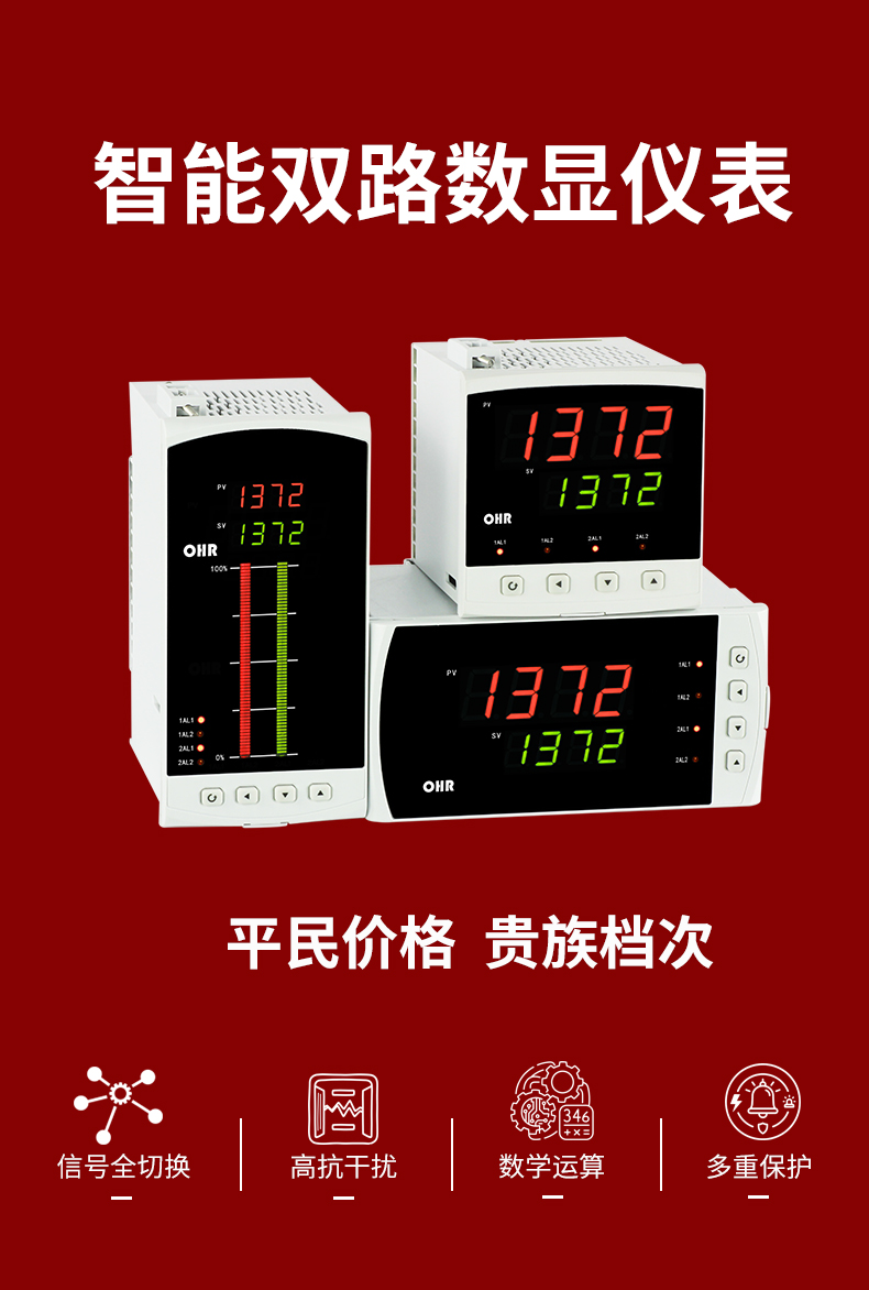 虹潤公司是專業(yè)生產(chǎn)數(shù)顯表的國家專精特新“小巨人”企業(yè),生產(chǎn)的智能雙路數(shù)顯儀表,具有全切換信號輸入,加減乘除數(shù)學運算,高抗干擾,過壓過流保護,RS485/RS232通訊等特點。產(chǎn)品獲得巡回檢測顯示方法及裝置、儀表殼體等2項國家發(fā)明專利,主持起草工業(yè)過程控制系統(tǒng)用模擬輸入兩位或多位輸出儀表、物聯(lián)網(wǎng)智能溫度儀表通用技術(shù)條件等2項國家標準,,以及通信系統(tǒng)多通道數(shù)據(jù)采集控制終端規(guī)范軍用標準,參與國際5G標準制定,取得雙回路數(shù)字顯示控制儀表等3項相關軟件著作權(quán)。產(chǎn)品廣泛應用于電力、石化、冶金、化工、造紙、食品、輕工、制藥、熱處理、水處理、機械配套等各種工業(yè)現(xiàn)場。